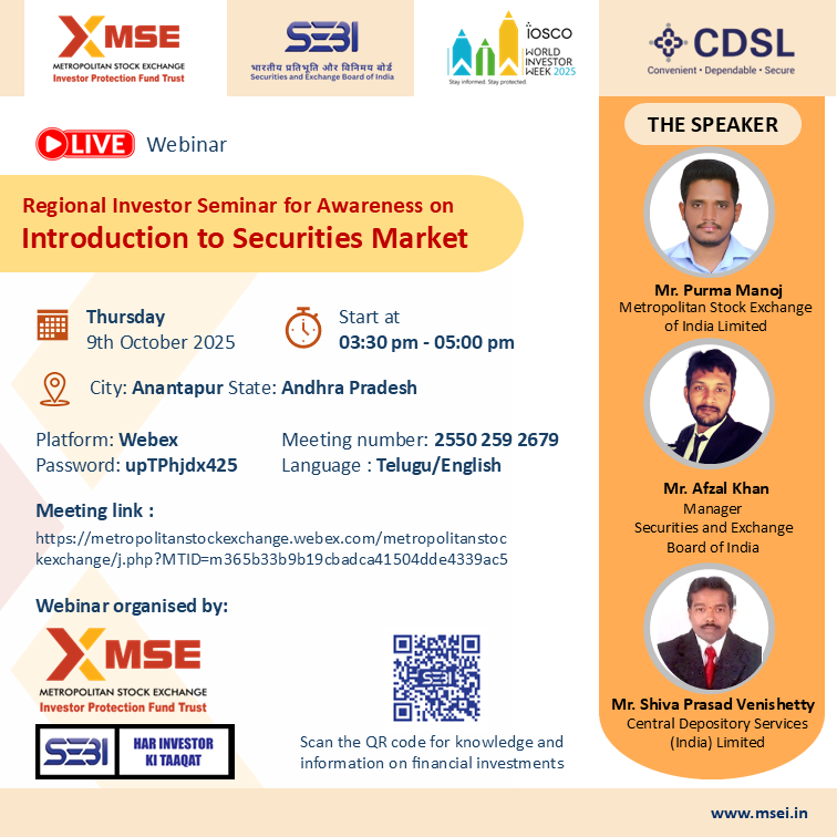 6 Oct 09, 202503.30 p.m. to 05.00 p.m.Introduction to Securities MarketAndhra PradeshAnantapurONLINE LINK Mr. Afzal Khan - Manager - SEBI