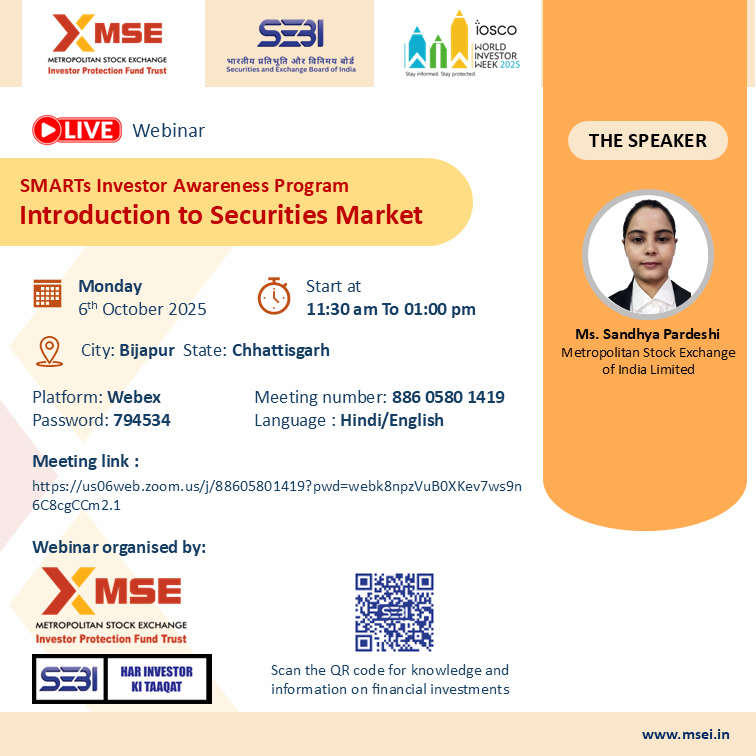 5 Oct 08, 202512:00:00SMART Investor Awareness ProgramChhattisgarhBemetaraPHYSICAL Government Industrial Training Institute, Nagar Panchayat Parpodi, Saja, Bemetara:-491335, Chhattisgarh. Bemetara -