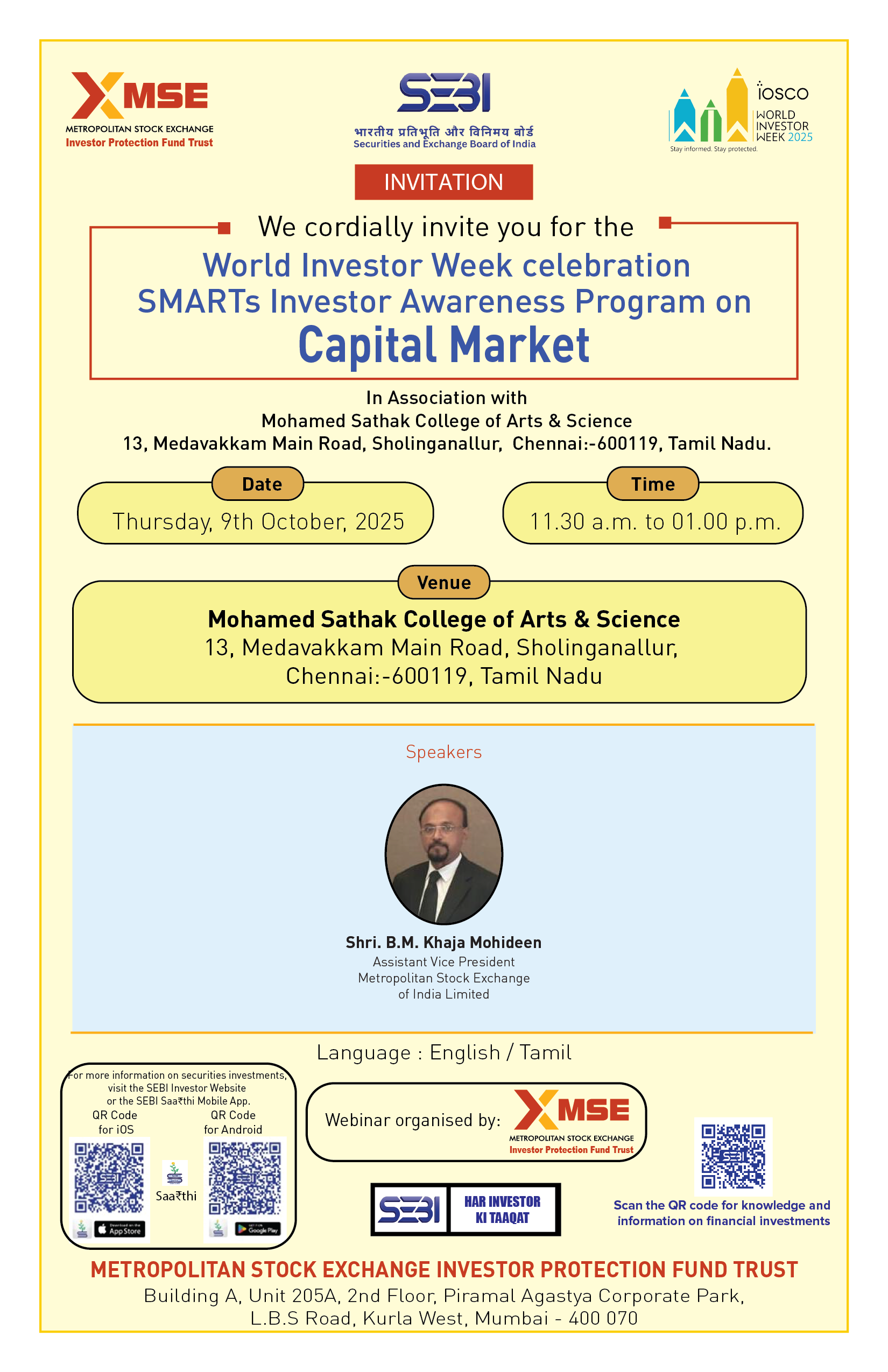2 Oct 09, 202511:30:00Introduction to Securities MarketTamil NaduChennaiPHYSICAL Mohamed Sathak College Of Arts & Science, 13, Medavakkam Main Road, Sholinganallur, Chennai:-600119, Tamil Nadu. Chennai -