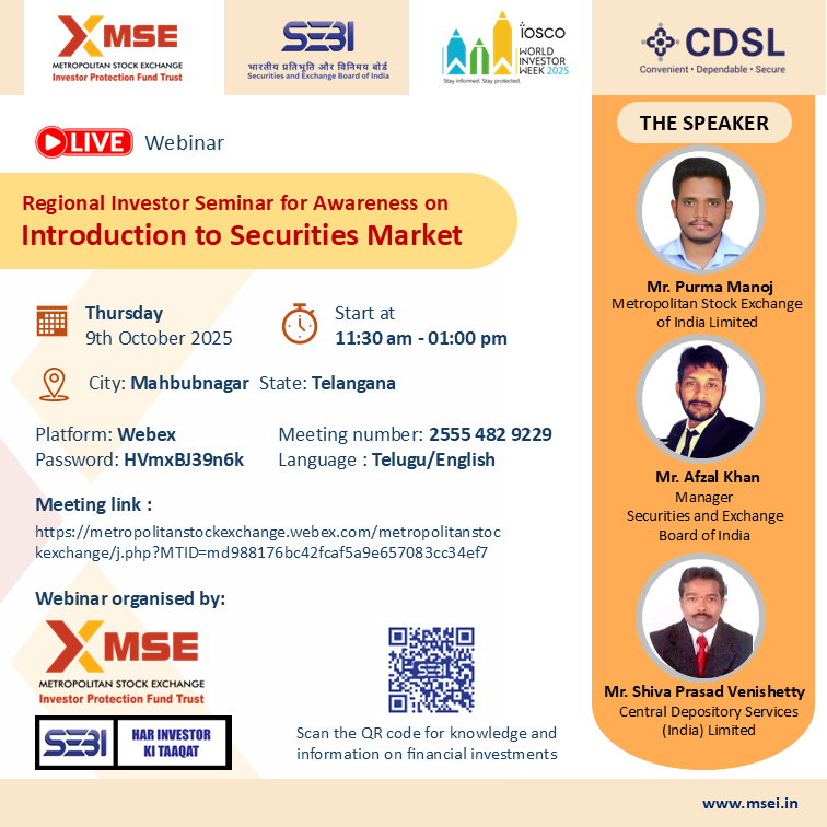 4 Oct 09, 202511.30 a.m. To 1.00 p.m.Introduction to Securities MarketTelanganaMahbubnagarONLINE LINK Mr. Afzal Khan - Manager - SEBI