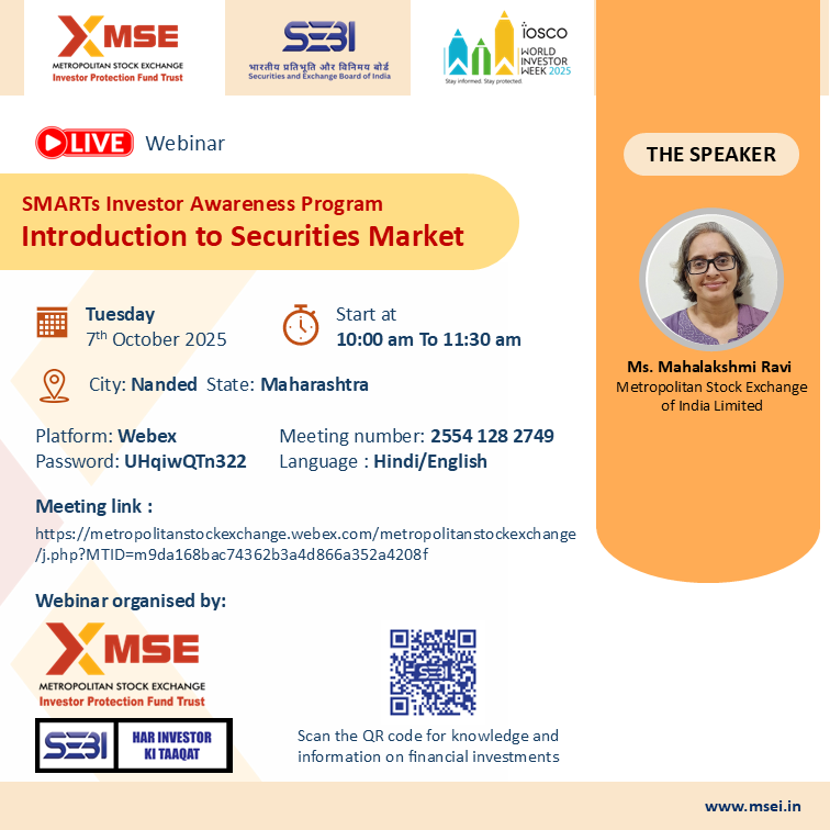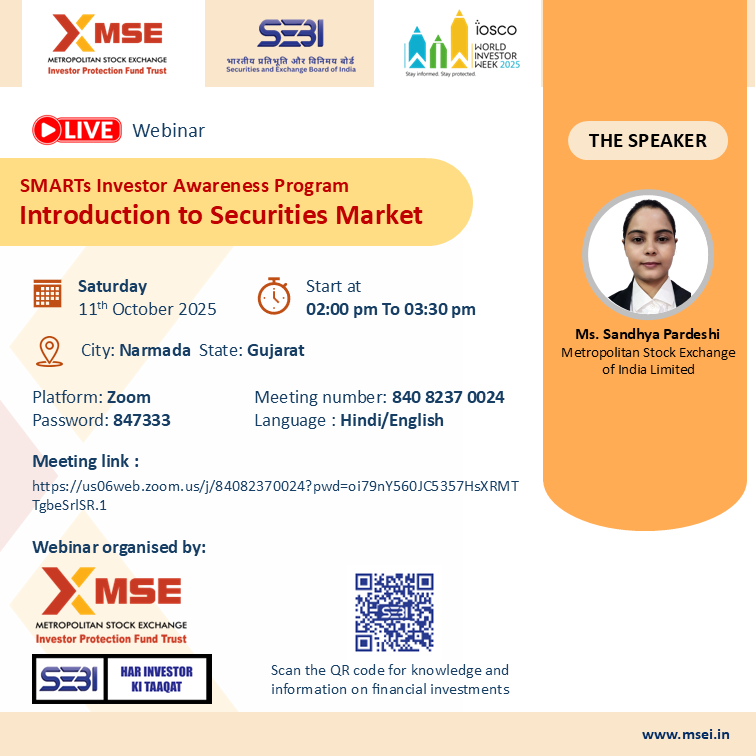 To know more about our upcoming awareness seminars or if you would like to organise Investor Awareness Programmes in your City, Housing Society, College, Institution etc., do write to us at iap@msei.in. Our representative will get in touch with you with the relevant assistance that you may require.